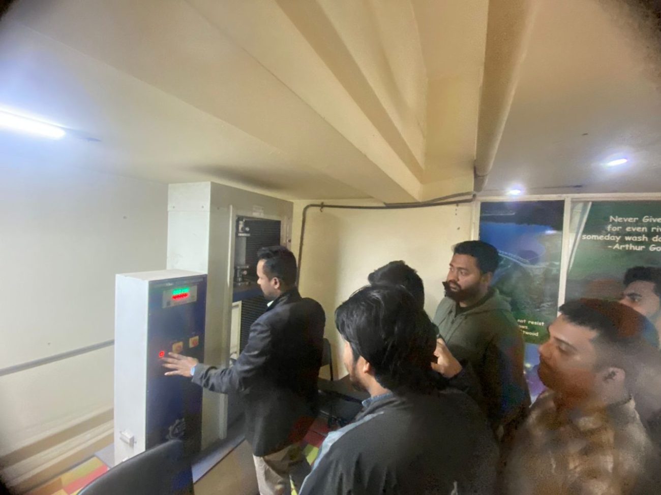 A group of students gathered around a Universal Testing Machine (UTM) during a laboratory session in the Materials Lab. Lab assistant is operating the control panel of the machine while the students observe the procedure closely.